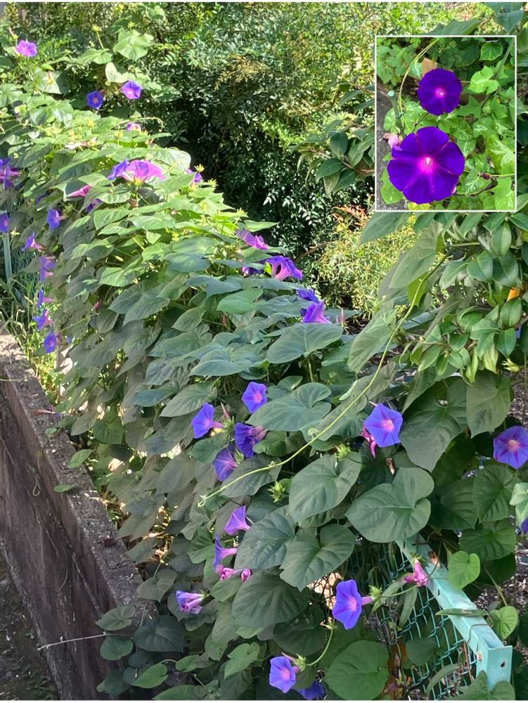 フェンスに絡まって咲いてました😊右上は、私の庭のアサガオです😉