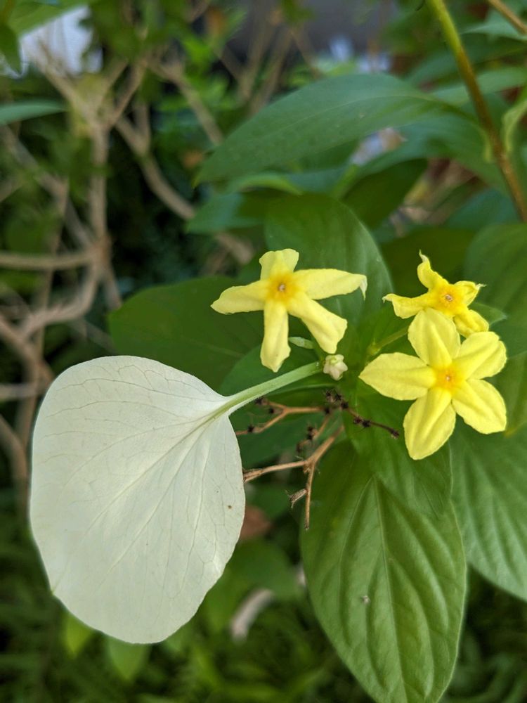 薄黄コンロンカは初めて見るお花です🌼そういえば少し薄い黄色で、でも、中に星型みたいな模様がちゃんとありますね👍