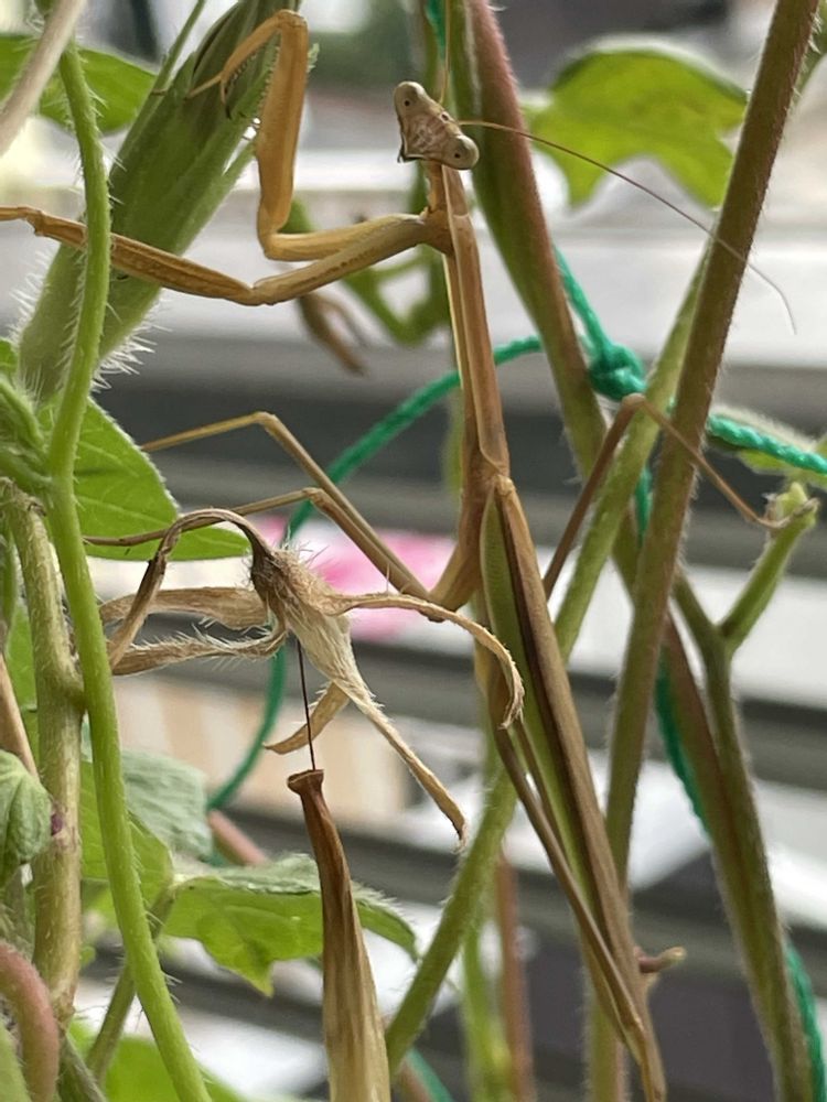 カマキリ君のこの色あい、少し枯れた朝顔のツルにそっくりやもんね❗️