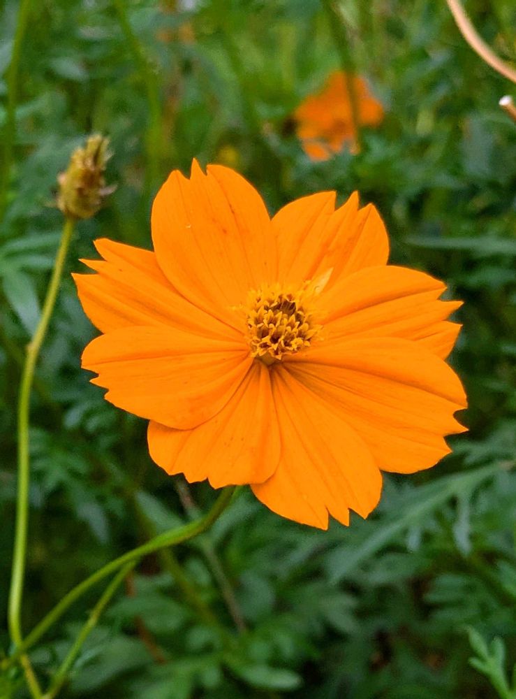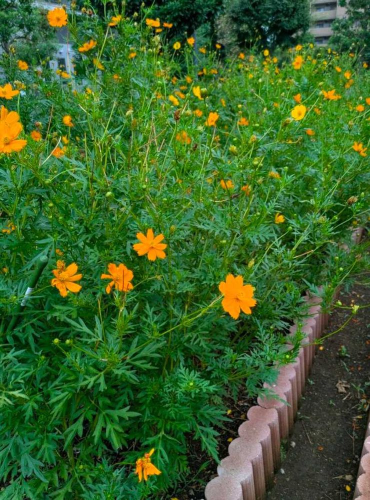 キバナコスモスはコスモスよりも葉の切れ込みが浅く幅広で黄色やオレンジ、赤色の花で暑さに強いのが特徴🧡