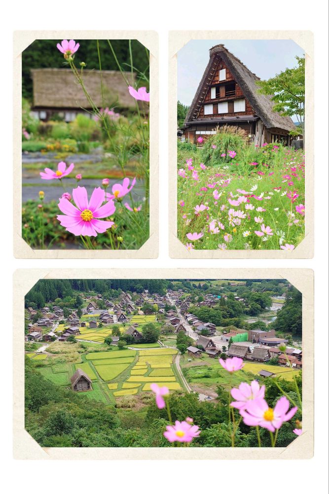 初秋の白川郷、コスモスやススキ、黄金色に色づいてきた稲穂など堪能しました。