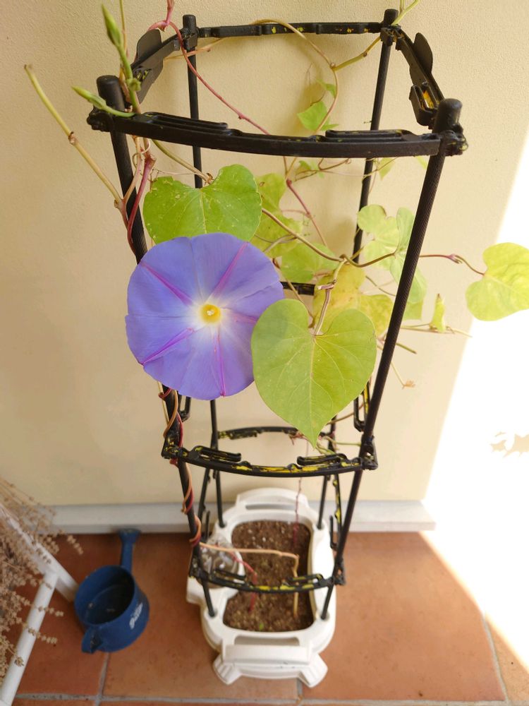 春先にアップしてました、塗装した小学校の教材用鉢に種蒔きしたアサガオが咲きました🌺
