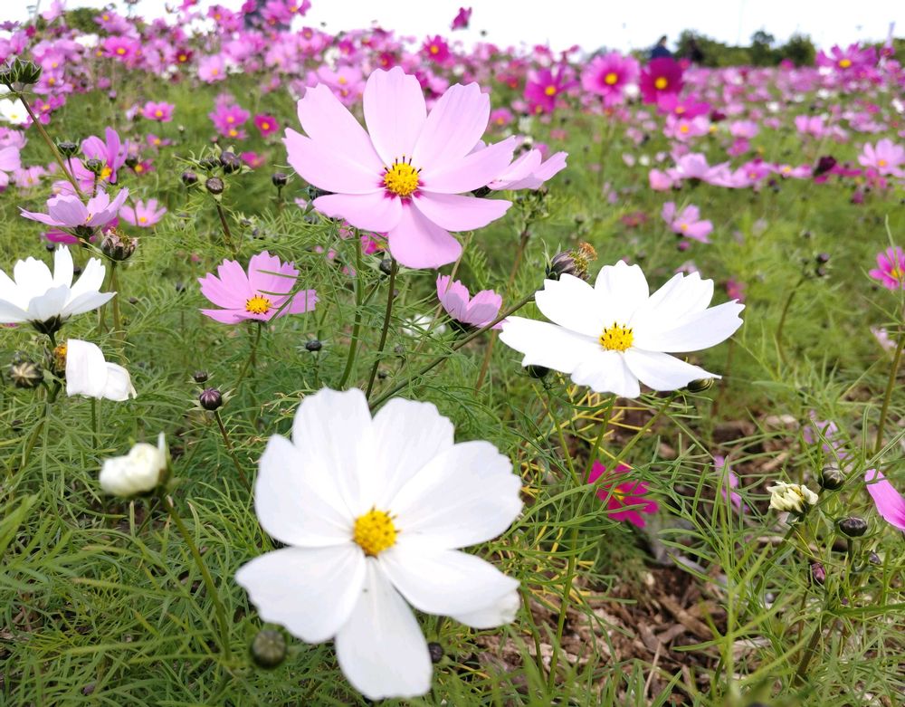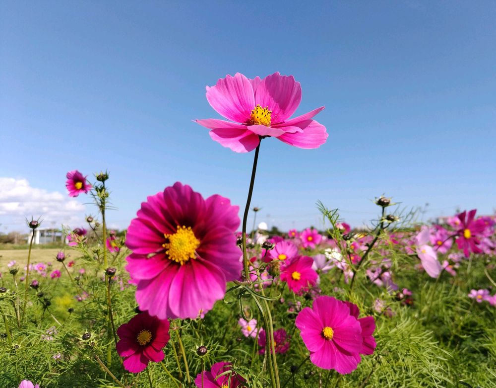 最近、家の近くで、夏の間中咲いているコスモスがあるんですよ!この暑い最中にどうして…と不思議に思っています