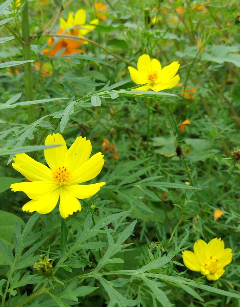 キバナコスモスの勢力が強過ぎる中、何とか隙間を縫って一生懸命咲いているレモンイエローコスモス❇️💛✨❇️