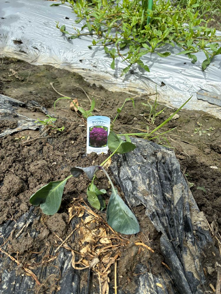 自家育苗のカリフラワーなつかりはかなり虫食い気味なのでプレバソンとBT剤などを散布、茎ブロッコリーのアレッタ2号はまだかいわれ大根状態です。