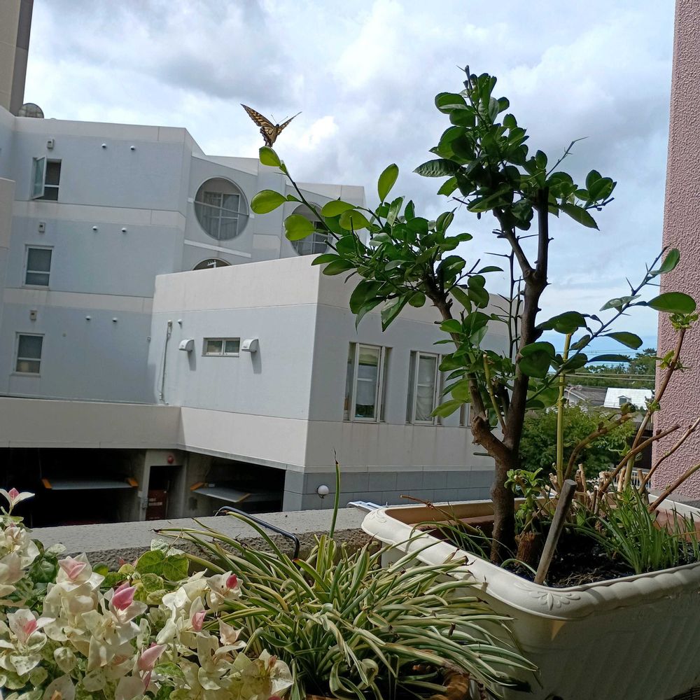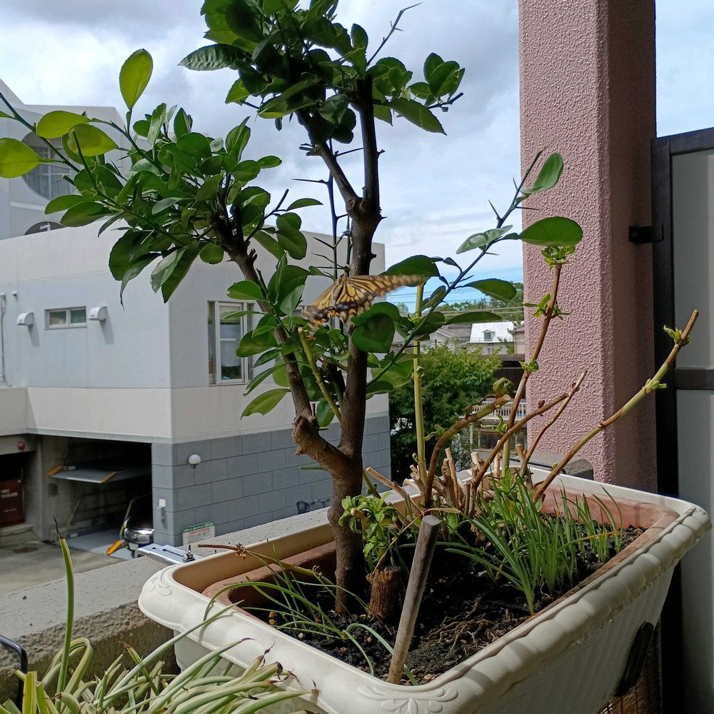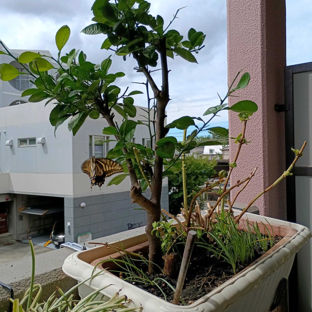 柑橘系の葉の香りに誘われてあっちゃんちのベランダまで飛んでくるなんて🦋
