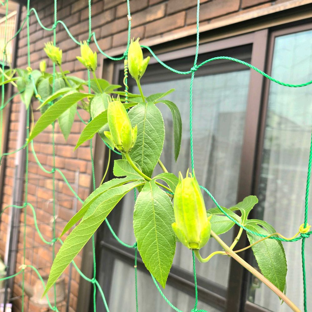 つるが伸びて足らなくなり…ベランダからネットを張ると気持ち良く伸びて次々開花してます。
