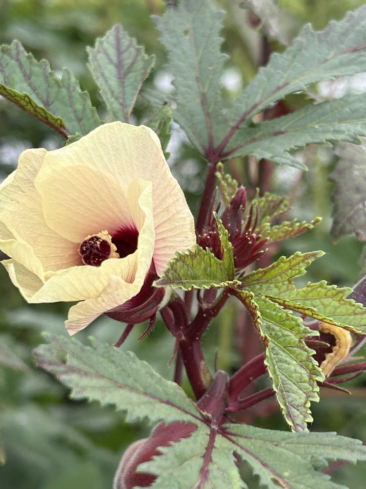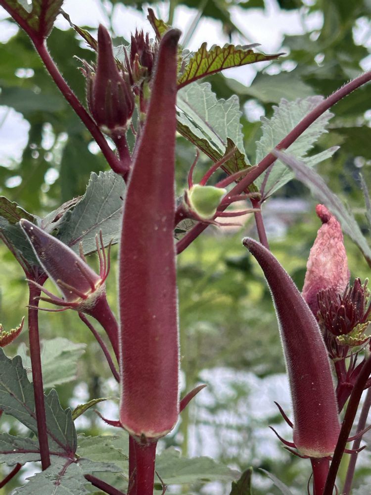 緑のオクラより花も茎も葉も赤身を帯びていますね❤️