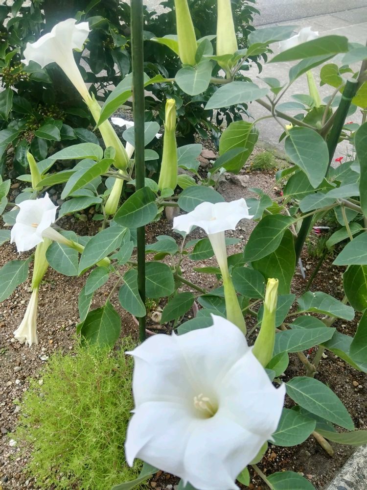 実生のチョウセンアサガオが我が物顔で枝を拡げて11ヶ程の花を咲かせています🍀