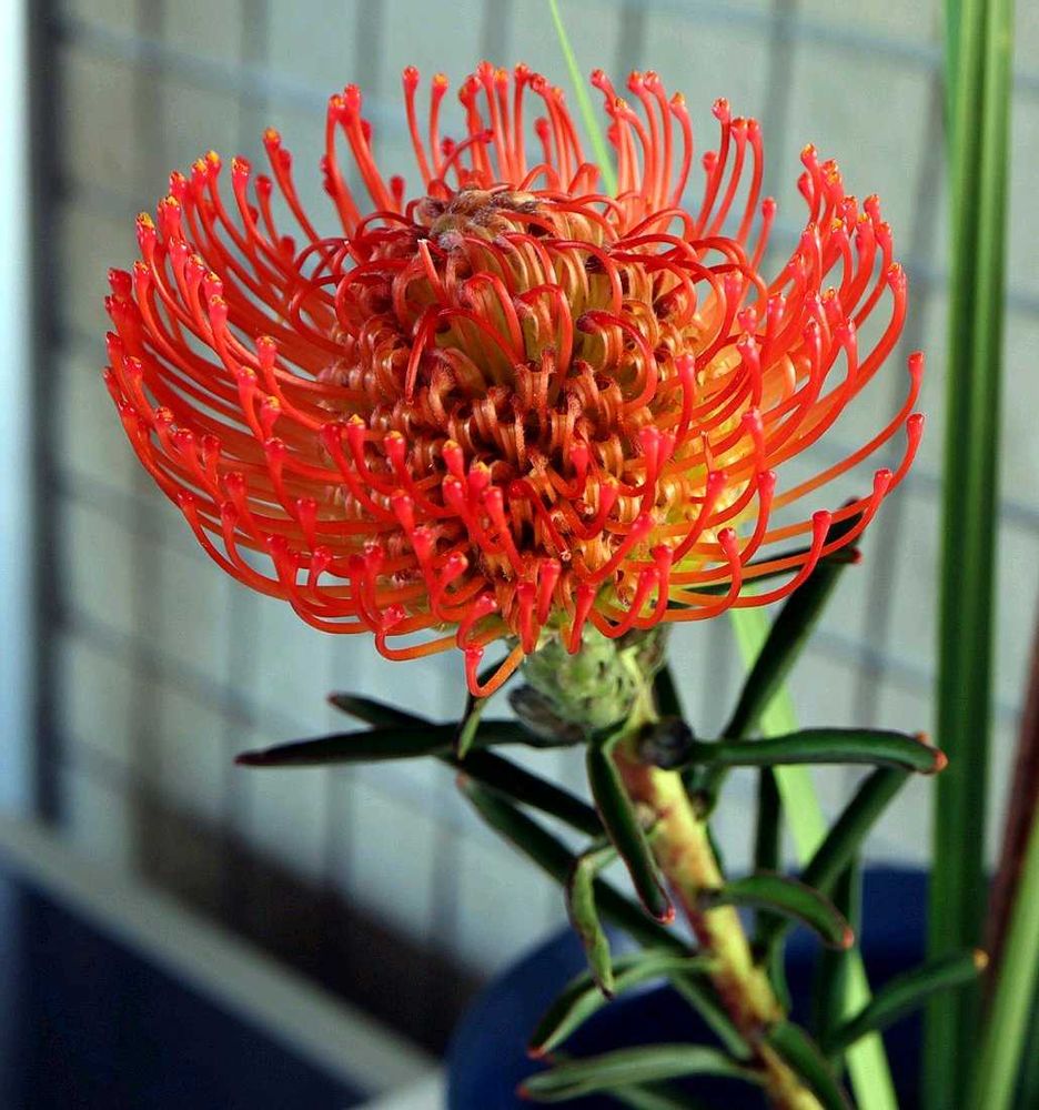 小さな花がたくさん集合してひとつの花を形成し、開花時になると針のように見える長い雌しべが伸びる。