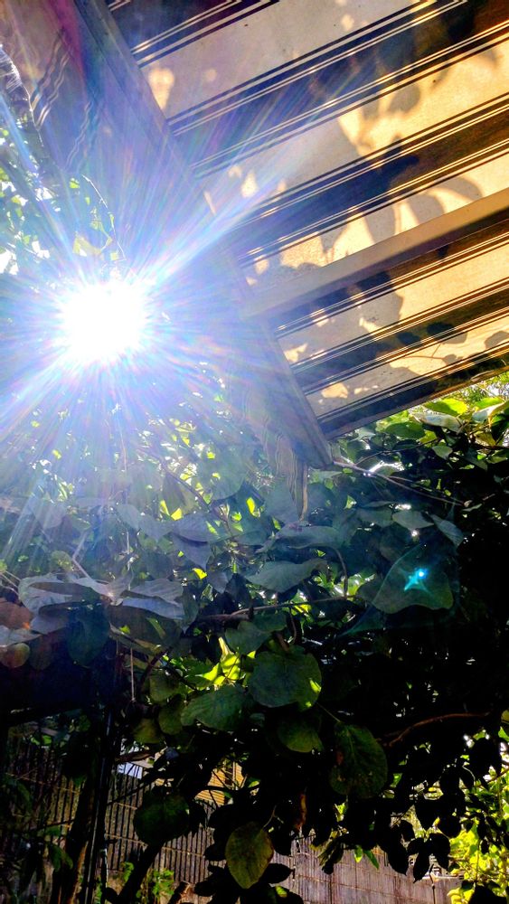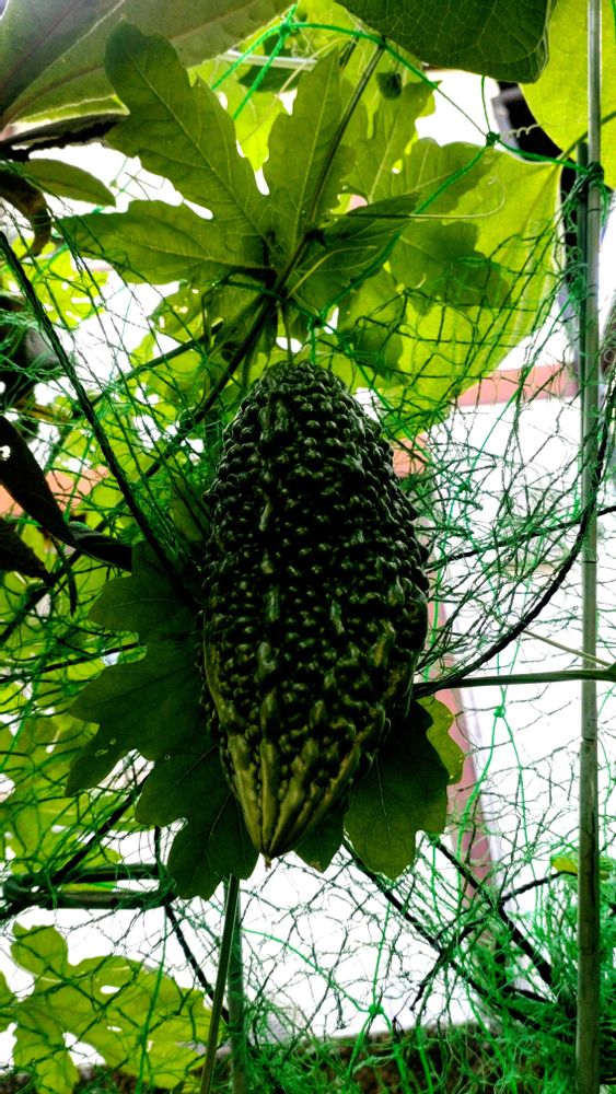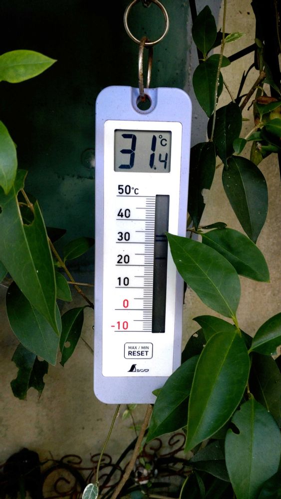 気温31.4℃、直射日光を避けて、庭の日陰なら、大丈夫です😆 今、大きくなりそうな、ゴーヤ😉