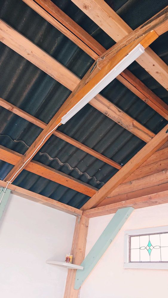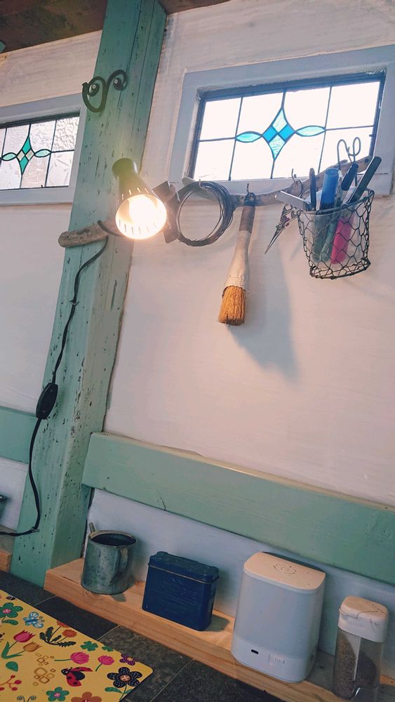 私の秘密基地💚作業小屋に電気を通してもらい、床とカウンターデーブルにフロアマットをひいてだいぶ、快適になりました🧡扇風機もつけたので昼間もなんとか過ごせます