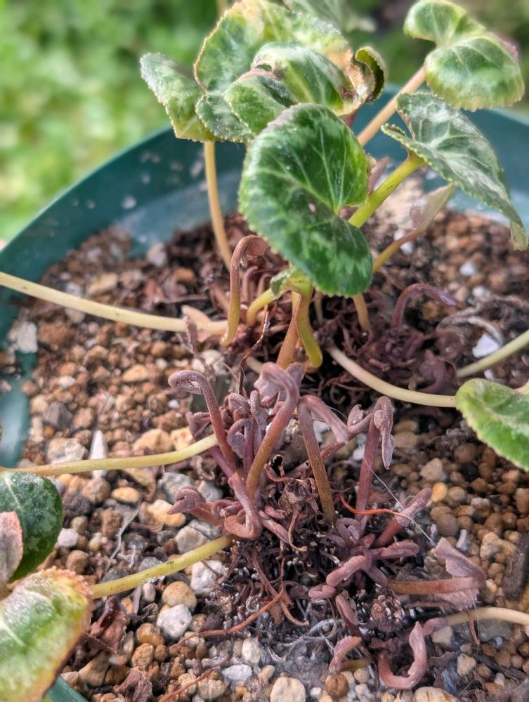 ガーデンシクラメン、ウニョウニョ茶色い新芽が生えてきてるよ🐿