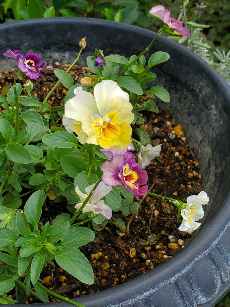 春に満開だったビオラやパンジーが種をこぼして、新たに芽を出して咲いていました。