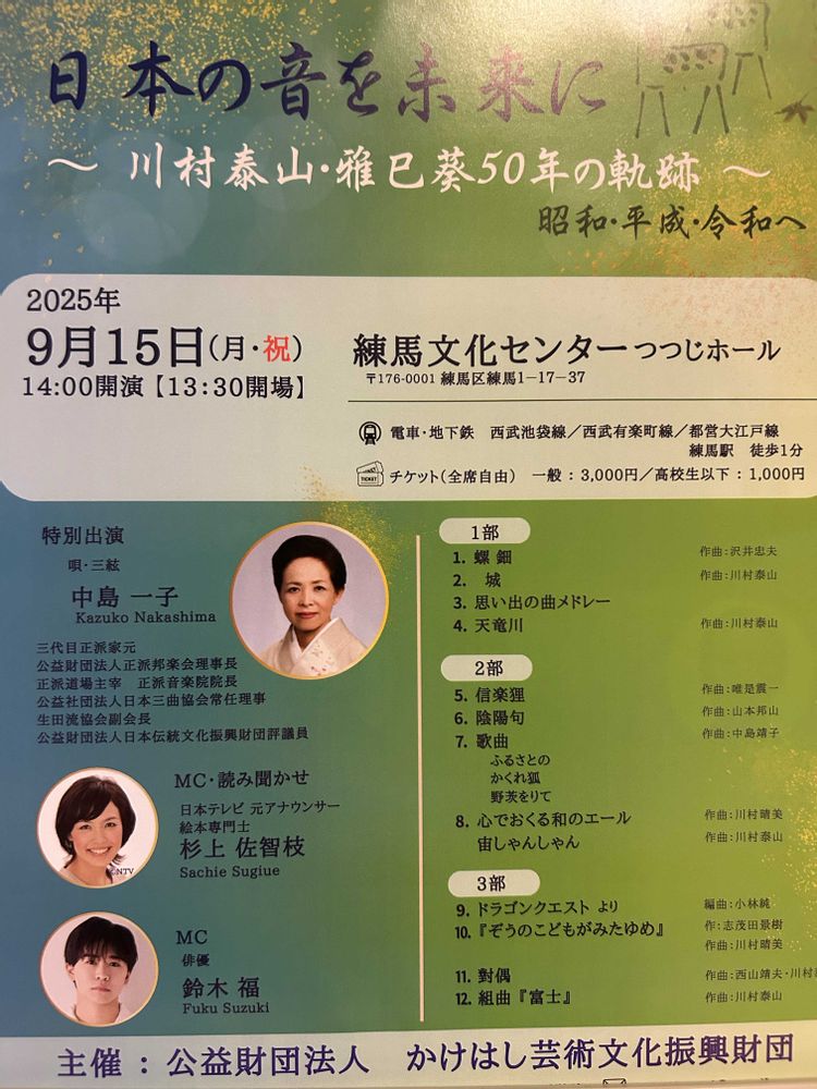 練馬文化センターで、尺八🪈と筝・琴の演奏会を楽しみました🤗🎶 鈴木福君の祖父母が主催する会の50周年記念を兼ねており、福君がプレゼンターの1人兼・演奏者でした😆
