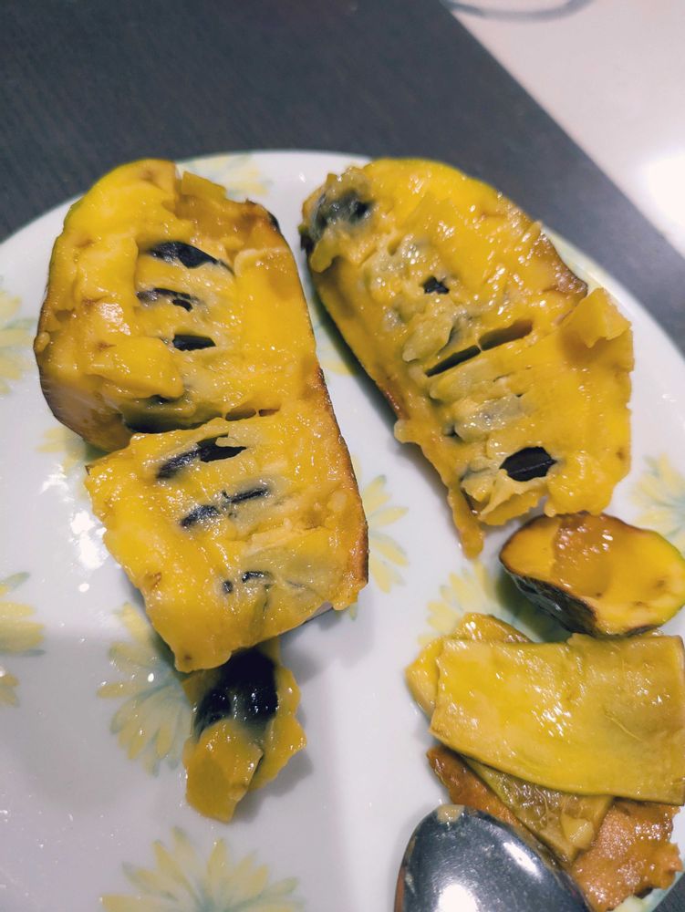 味は洋梨とマンゴーを混ぜたような感じで、甘みの後にゴーヤのような苦みが来ます。わりかし苦みは強めで後を引きます。果実が未熟だと苦みがあるとの事でしたが、これ以上熟すとぐちゃぐちゃになりそう…食感はねっとりしてます。