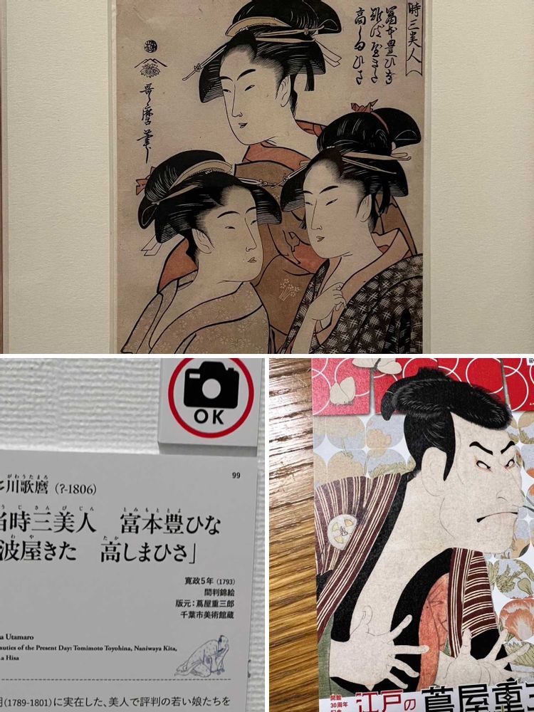 ③千葉市美術館の企画展にて撮影OKだった歌麿の『当時三美人』と、チケットに描かれた写楽の『三代目大谷鬼次の江戸兵衛』