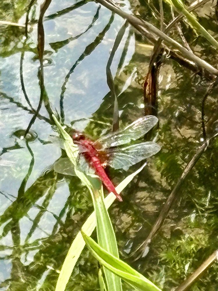 水辺に赤とんぼが。フレームに収めるのがやっとだったので、ピンボケあしからず。