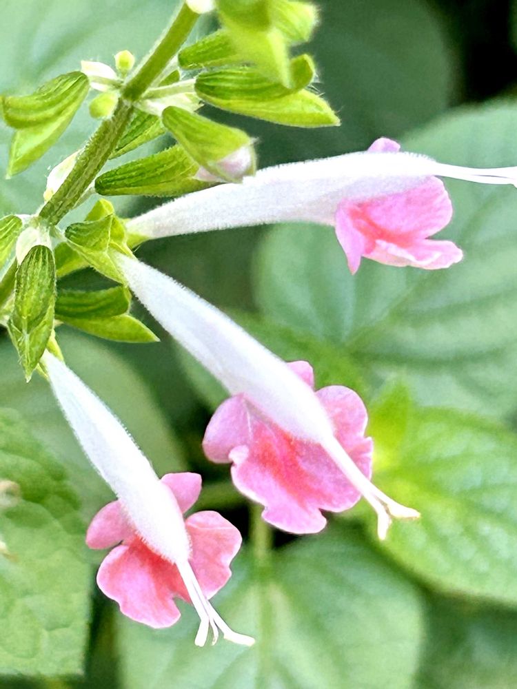 サルビア フェアリーピンク、ガラニチカ、ストロベリーセージ、コクネシアが猛暑の中、咲き始めて来ました🤗少しは秋を感じているのでしょうか🌿💕🌿