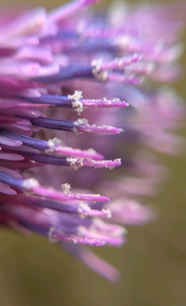 紫色をした雄しべ筒からピンク色をした雌しべが伸びて花粉を押し出す、キク科おなじみの 火曜はマクロの発表会🏷