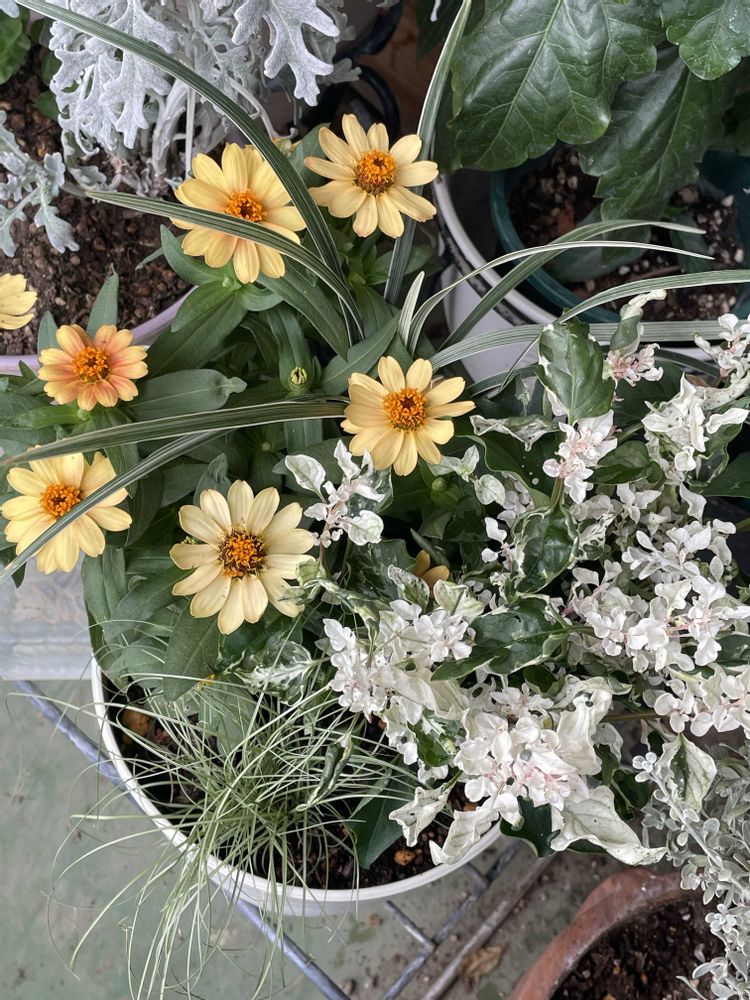 お迎えしたジニアと斑入りのアルテラナンテラとグリーンのカレックス、あと、ベランダで育っていたミスキャンタスも足してみました🪴