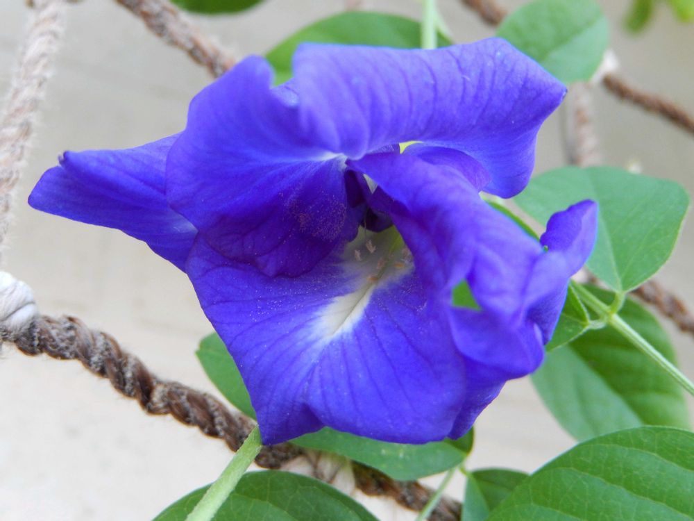 バタフライピーの花が咲きました.5月の弘法さんで,見つけたバタフライピーの苗.こちらは,八重の方.普通によくある一重の方は,すぐに枯れました.残った方も,葉がどんどん落ちて,今やっと,一輪目が咲きました,すごく上の方で.