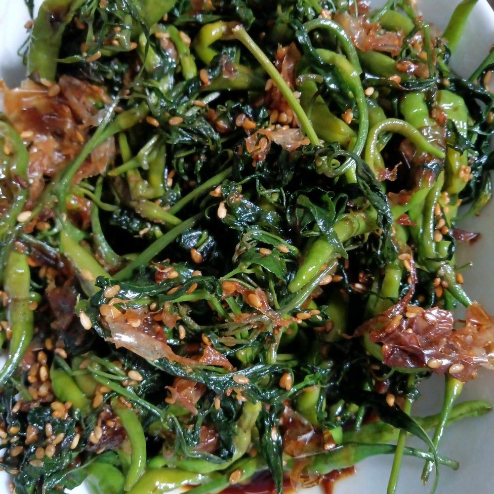3️⃣ひもトウガラシと柔らかい葉っぱ部分を佃煮風に味つけしてます😊