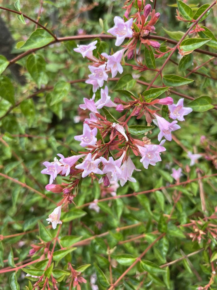 ピンクのアベリアです。和名は「ツクバネウツギ」といい、これは花が終わった後に残る萼片が、羽根つきの羽根に似ているからです。