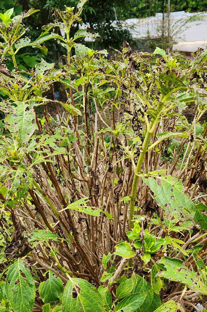 紫陽花の葉、こんなに食べられてしまって、ギャフン‼️ですね