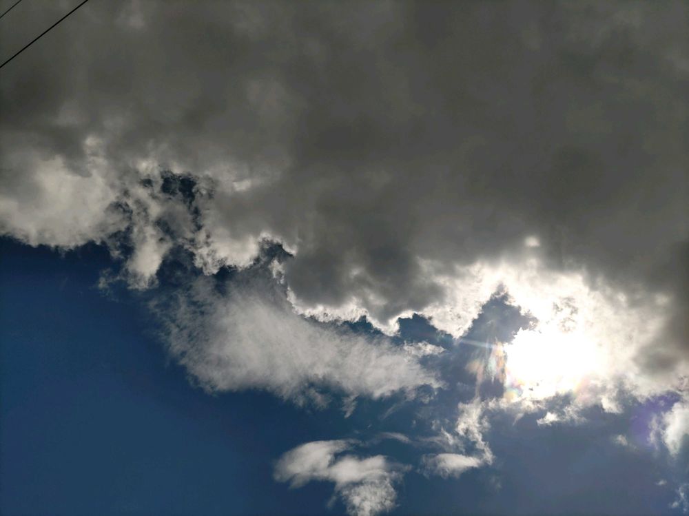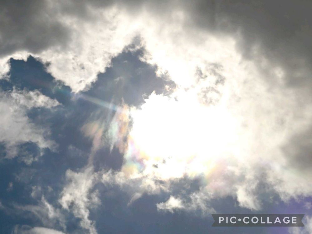 午後12時24分頃です。急に曇りだし、慌てて洗濯物入れた途端、雨がいきなり降りだし、道路が濡れる程でしたが、又パッと止み日射しが差して来たのでもしかしたら、虹🌈が見えるかな?と急いで外に出ましたが出てないので、太陽☀写して見たら、あらっ!もしかして彩雲?でしょうか?