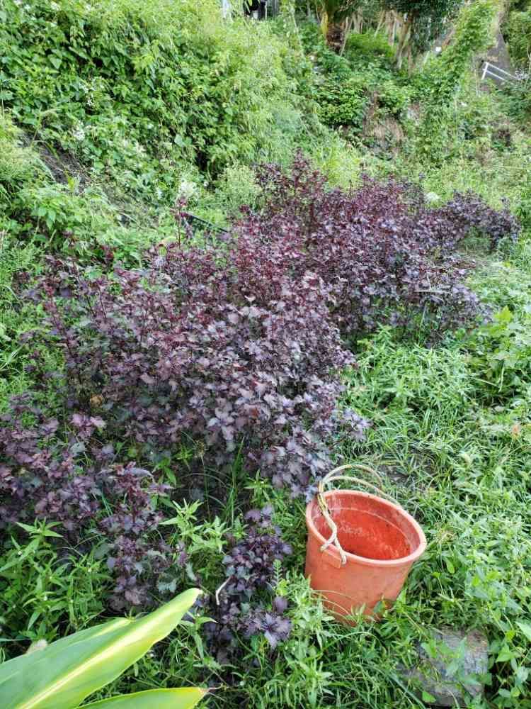 畑につくと、チヂミ赤紫蘇が雑草に負けず、さらにもりもりと生えていた