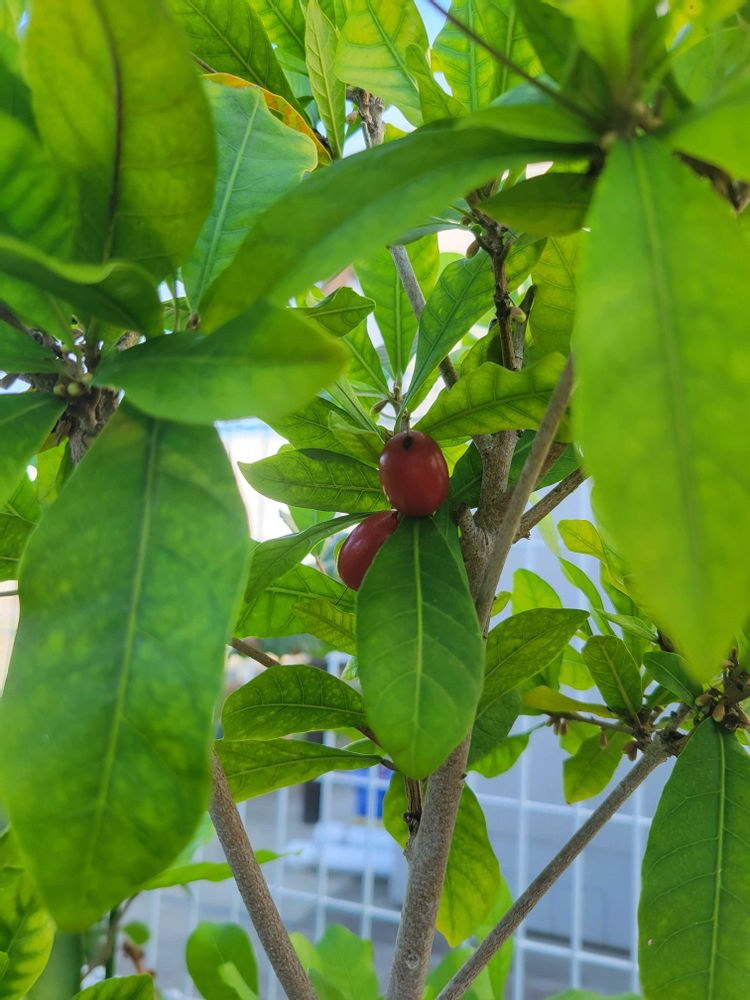 昨年買ったミラクルフルーツの木に実が2個だけつきました。