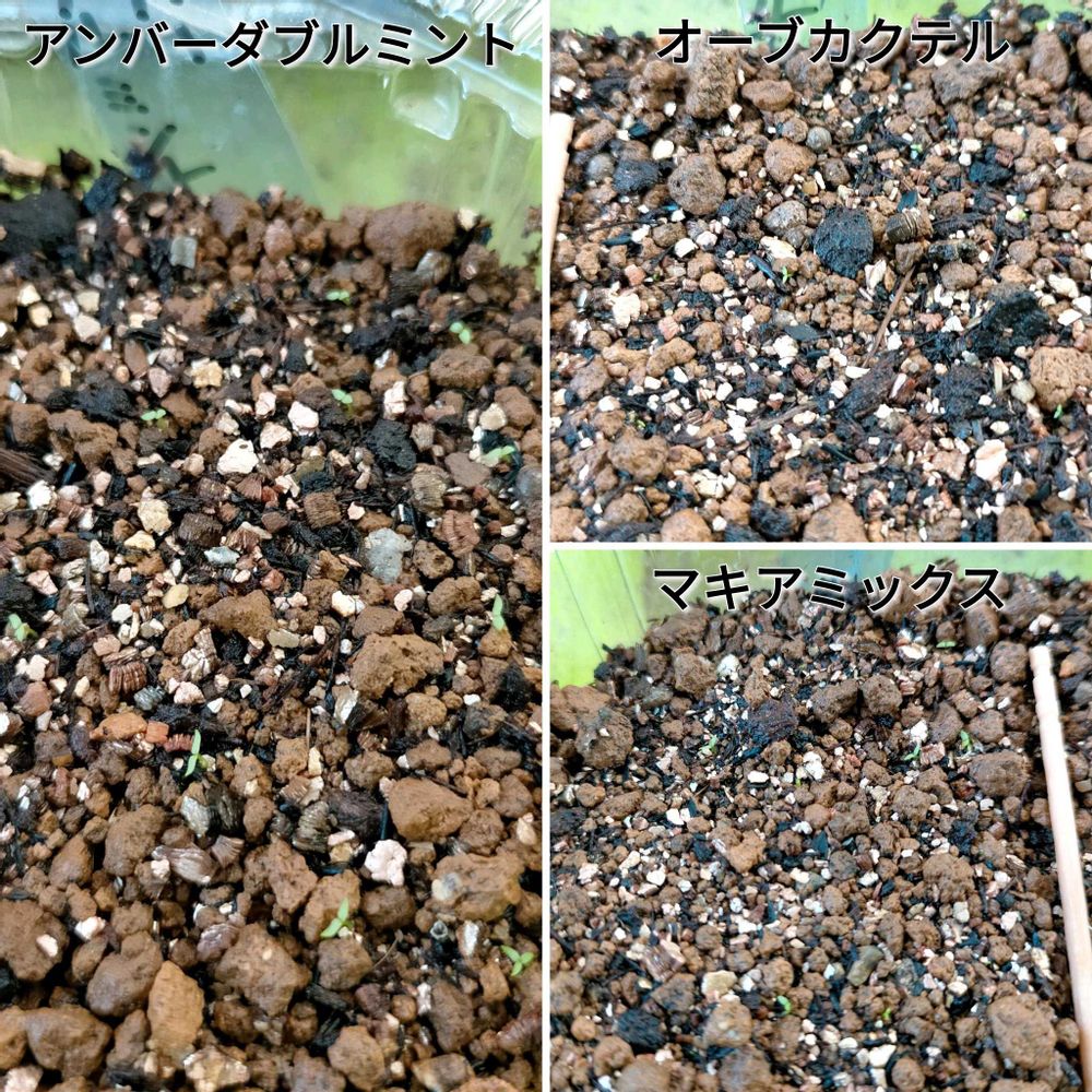 左は早めに発芽し始めたアンバーダブルミントで、こちらは出揃った感があります。右のオーブカクテルとマキアミックスはもう少しかな。