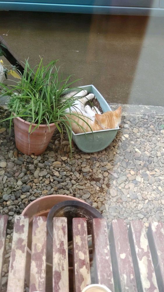 ④今朝、庭にねこちゃん、黒、キジトラ、茶トラ(赤ちゃん)がしばらく遊んでいました😺