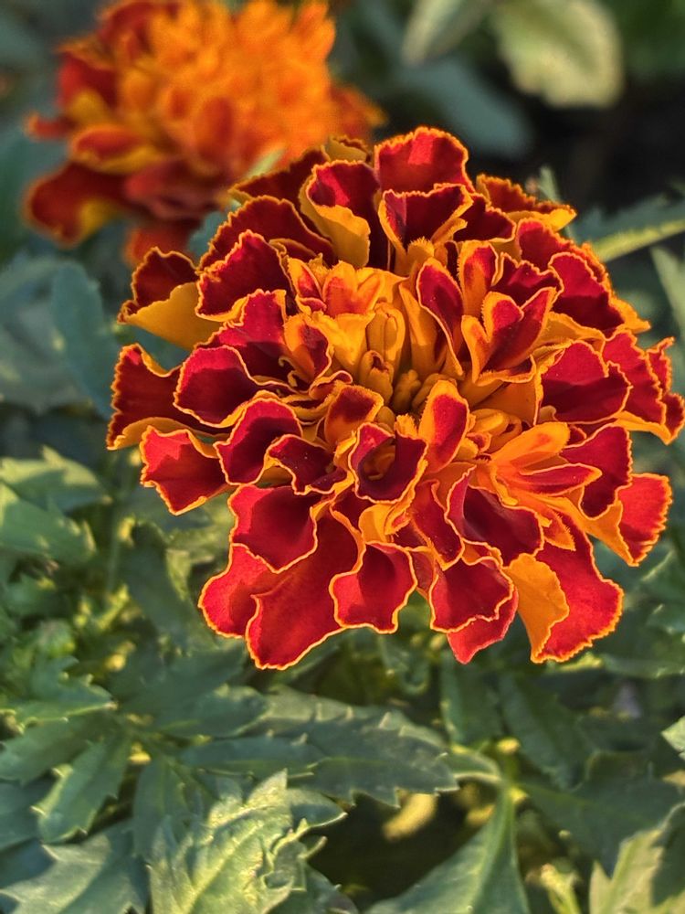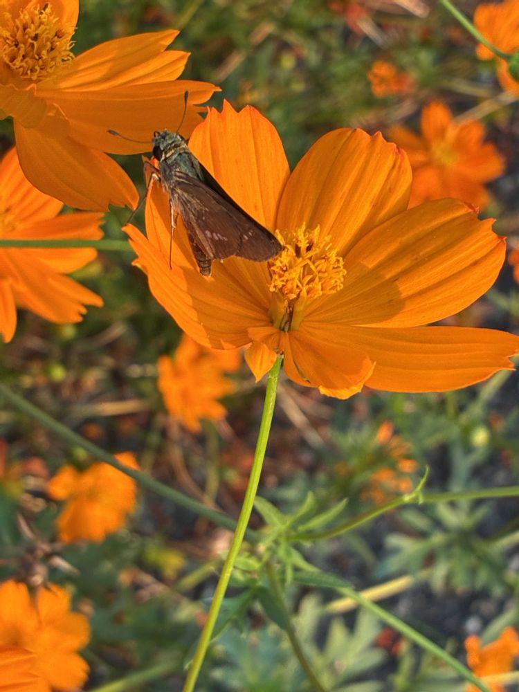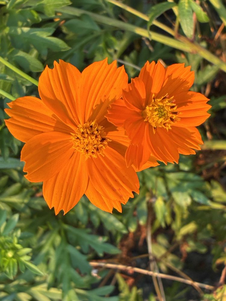 夕暮れ時、道路沿いの花壇にて夕日に映えるオレンジ色の「ジニア」「マリーゴールド」「マツバボタン」「キバナコスモス」をパチリ!📸🧡🌿😄🤗🌇🌞👌