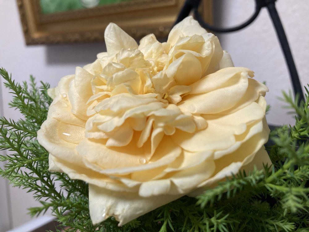 高い所の頂芽に咲いた花をカットして、葉っぱが無いのでゴールドクレストに包んで貰いました😹