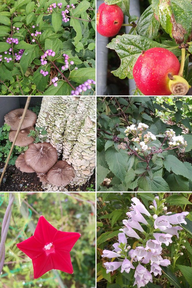 色づいたムラサキシキブ、真っ赤になったサンザシの実、生えてきた謎のキノコ🍄🟫、唯一生き残りのユーパトリウムチョコレート、こぼれ種ルコウソウ、毎年顔を出す花トラノオ