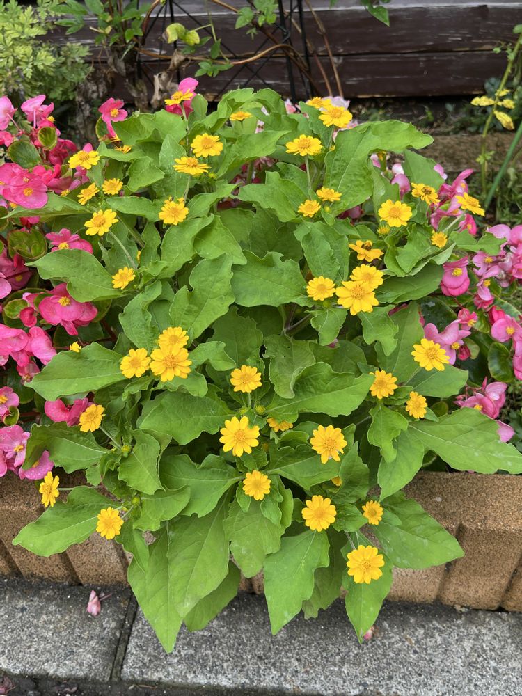 去年のメランポジュウムの溢れ種から出た芽が今年のベコニアの間から覗いて1ヶ月 こんなに大きくなっていっぱい花を付けています 丈夫な花らしいですがほんとですね スライドしてね