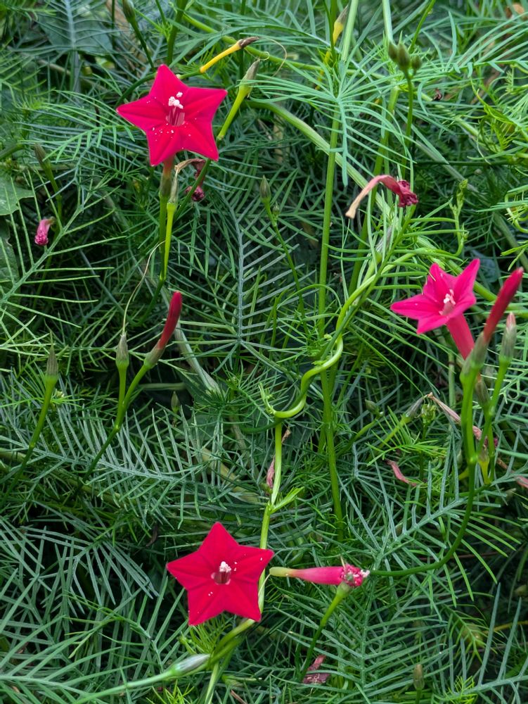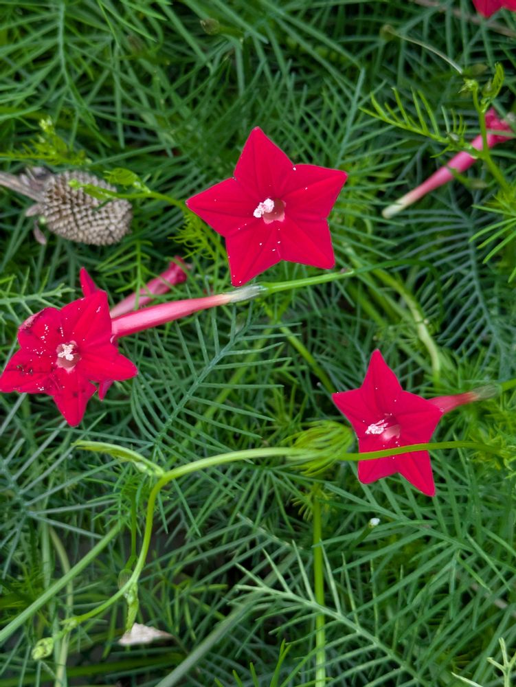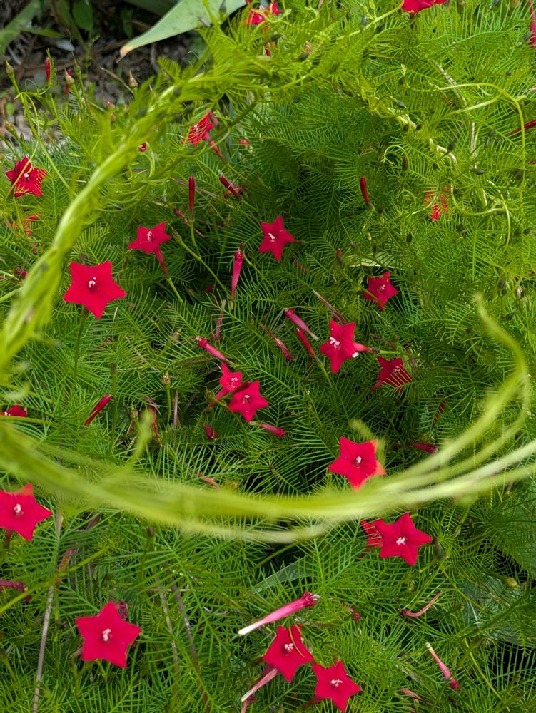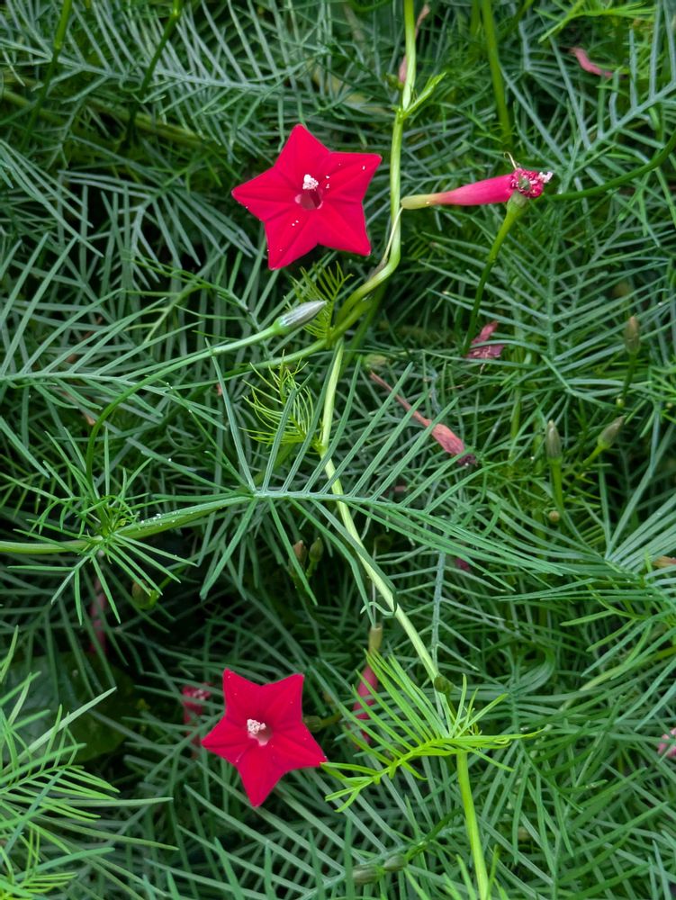 蔓状のホソバの緑、その中、星形の赤花。