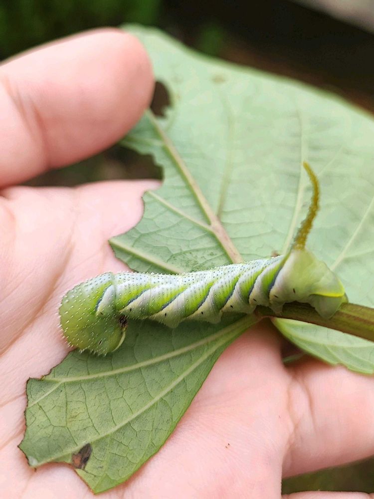 Googleレンズで調べたところ、クロメンガタスズメという蛾の幼虫らしいです。