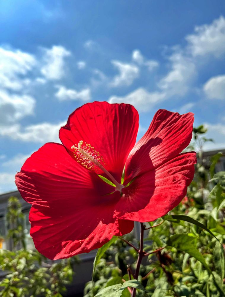 古くからの友人と最後のお別れの後、公園で空に向かって揺れていたモミジアオイ。花言葉は穏やかに。R.I.P