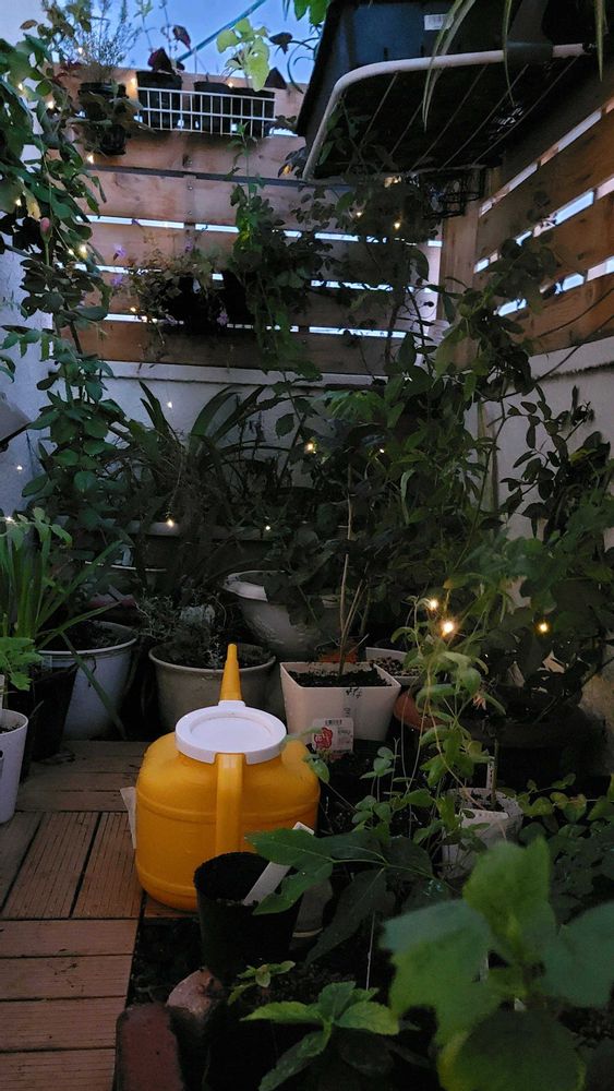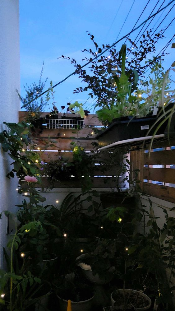 小さな小さなベランダで、所狭しと植物たちがひしめき合う中、ソーラーイルミネーションで、夕暮れから夜の間は、ほっと安らげる空間になってます。(* ˊ꒳ˋ*)☕