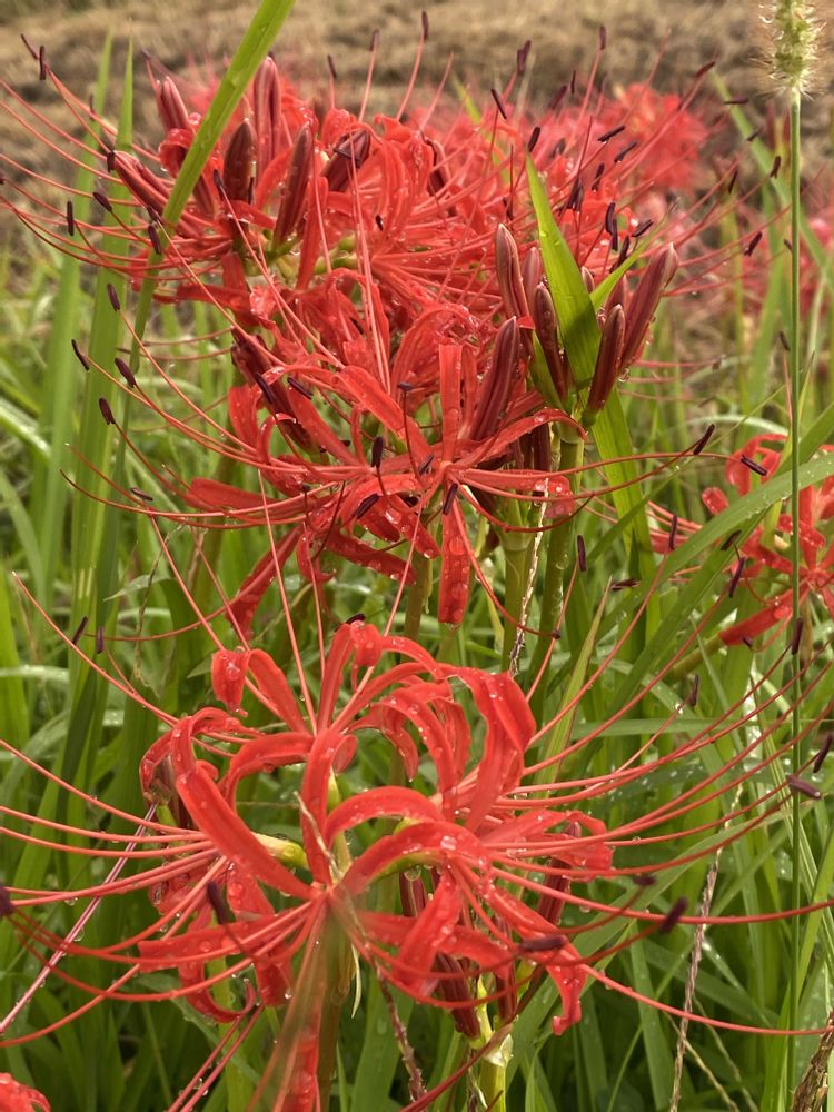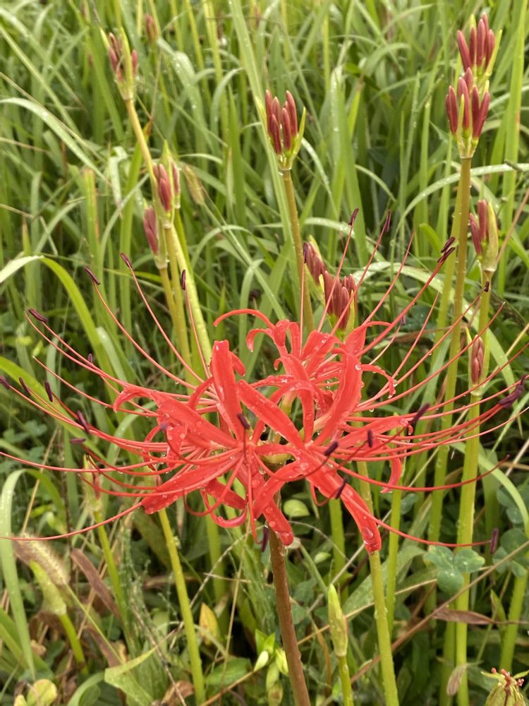 昨夜の雨でまだ濡れているヒガンバナを見つけました