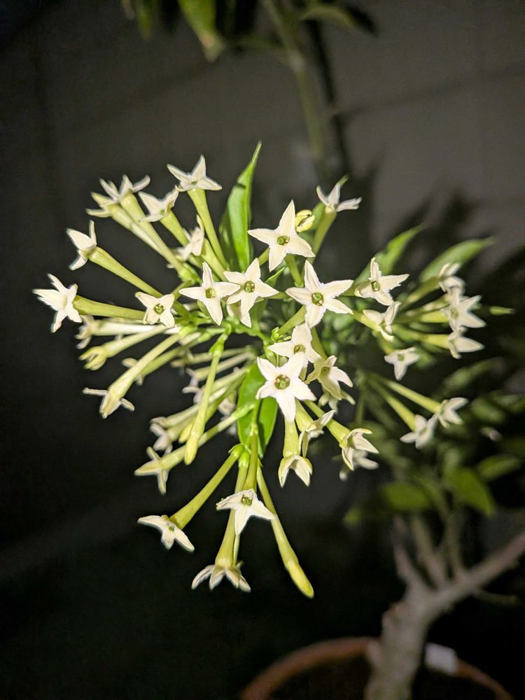 今夜は夜香木が咲き始め風に吹かれて青りんごのような甘い香りが辺り一面に漂っています。そして那覇ではじゅり花と呼ぶ方がいるそうで由来は花街、辻で生活を営んだ女性(じゅり)じゅり花は夜に咲き魅惑的な香りである事から客寄せのために昔は各料亭に植えられていたそうですよ!