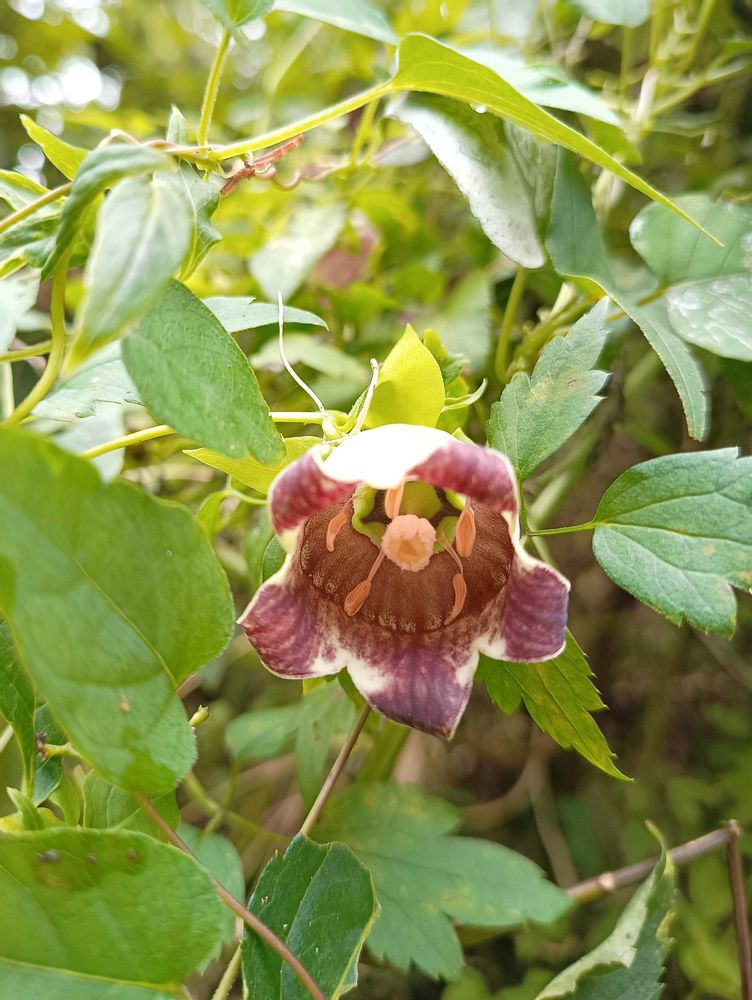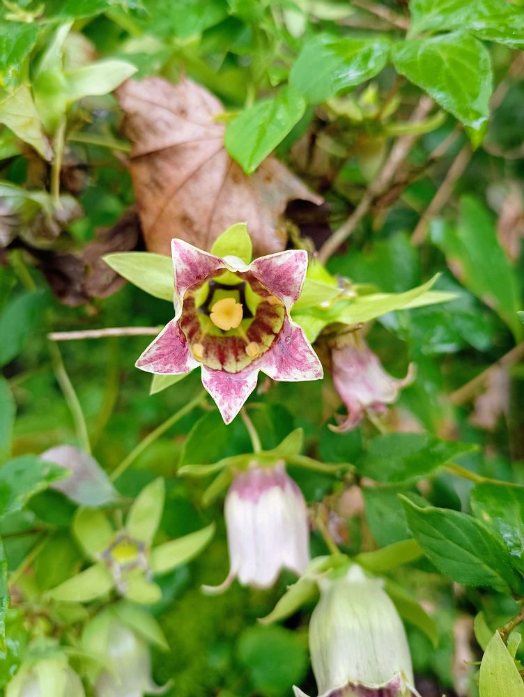根が太く朝鮮人参によく似ていることからツルニンジンと名付けられました。つるは長くなると2メ-トルほどまでのび草などに巻きつく、葉は互生して枝の先では3~4枚が輪生し葉の裏は白っぽい粉を帯びます。花は内側に紫褐色の斑点があり目玉の様な面白い特徴の花を咲かせます。古くから漢方薬として用いられる注目の野草です。