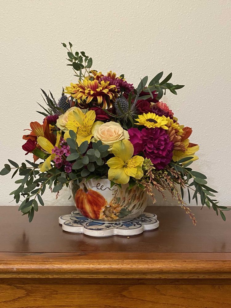 バラやキクや色んなお花が、全体的に上手く統一感があります。色合いもバランス良く落ち着いた生花になっています。😄🌞✌️