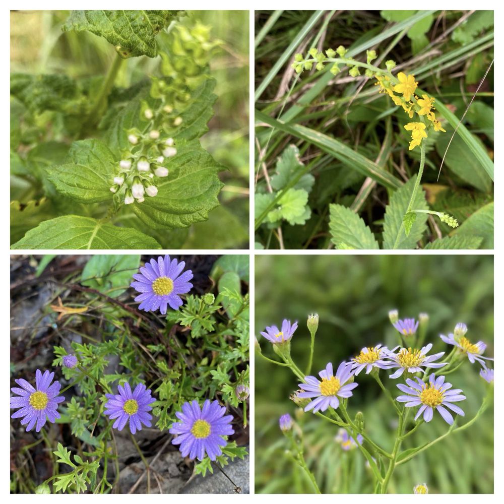 青紫蘇、キンミズヒキ、星空マム、シオンが咲いています🤍💛💜🌿