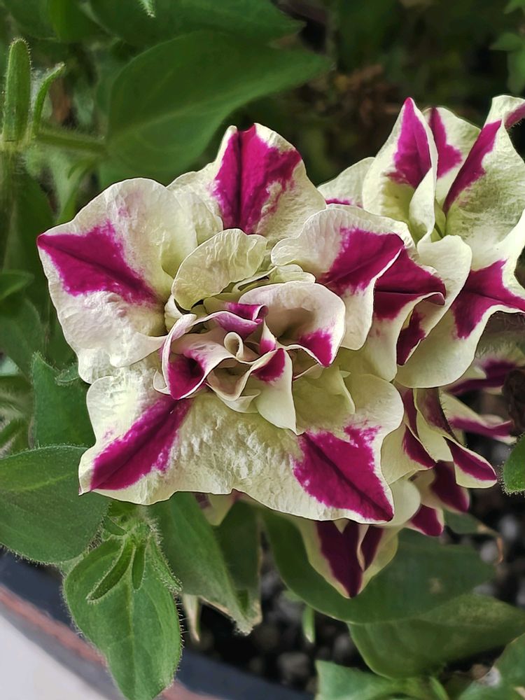 ワイン色とクリーム色のペチュニア初めて見たよ。きれい😊素敵だね!
