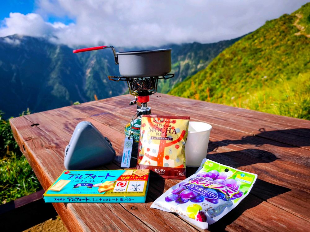 その山小屋の外のベンチを拝借しコンビニおにぎり🍙とコーヒー☕で30分ほどの朝食タイムです🎶