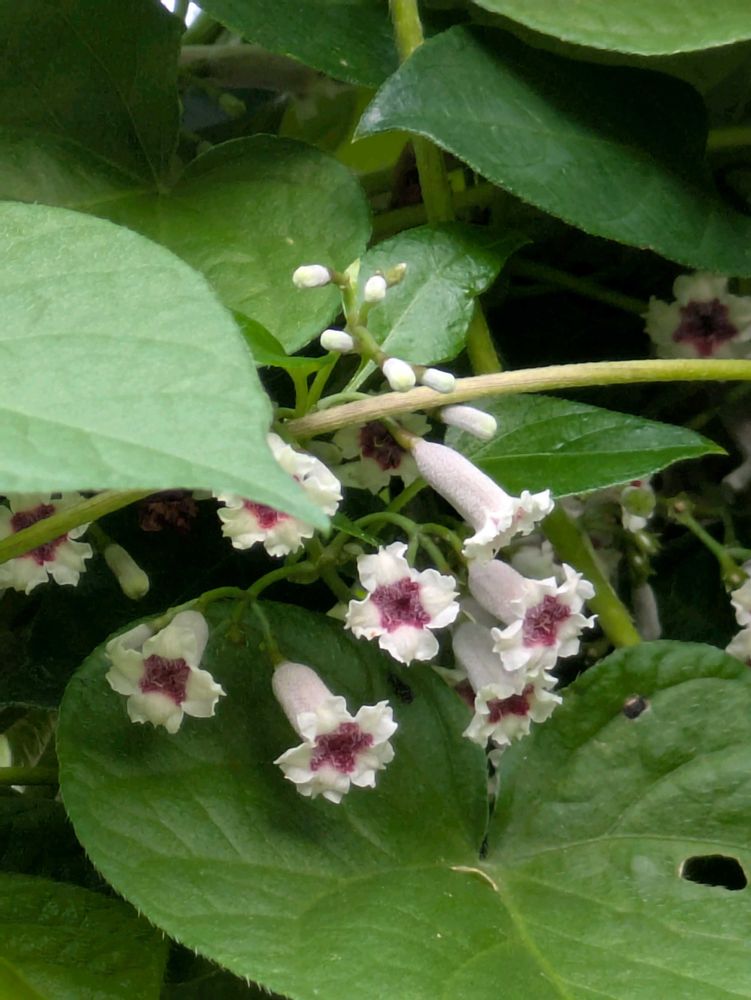 朝顔の中にヘクソカズラの花が咲いています。38年いて初めてこの花が咲きました。驚きました。嬉しくないです。